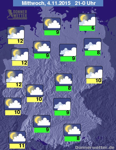 Die Abendstunden bestimmt eine trockene Mischung aus lockerer und aufgelockerter Bewölkung. In der ersten Nachthälfte sinken die Temperaturen auf Werte um 12 Grad C am Niederrhein und um 8 Grad C im Chiemgau.