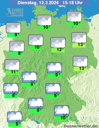Am Nachmittag zeigt sich der Himmel meist stark bewölkt oder es ist bedeckt, dabei muss vor allem im Süden und der Mitte zeitweise mit Schauern gerechnet werden. Im Norden und Osten bleibt es überwiegend trocken.