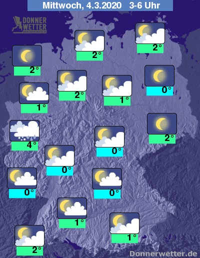 In den frühen Morgenstunden verdichten sich die Wolken vielerorts, einen freien Blick in die Sterne gibt es vereinzelt noch in der Osthälfte sowie an der Nordseeküste. Im Westen setzen erste Regen-, Schneeregen- oder Schneeschauer ein.