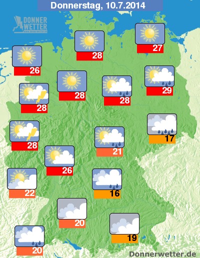 Am morgigen Donnerstag können sich besonders von der Mitte bis in den Osten gebietsweise Schauer und Gewitter bilden, sonst bleibt es bei meist wechselnder Bewölkung aber die meiste Zeit trocken. Die Temperatur steigt auf 16 Grad an der Fränkischen Alb und 29 Grad in Berlin.