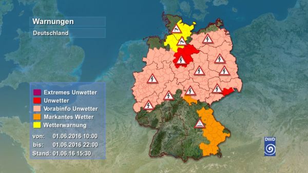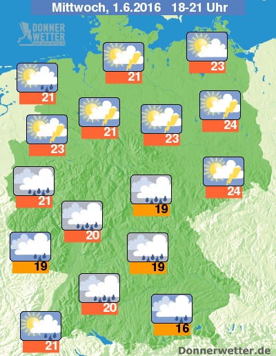Weiter nach Süden hin bleibt die Wolkendecke meist verschlossen und es fällt verbreitet, gebietsweise auch starker und gewittriger Regen. Die frühe Abendtemperatur liegt bei 16 Grad in München und um 24 Grad in Berlin.
