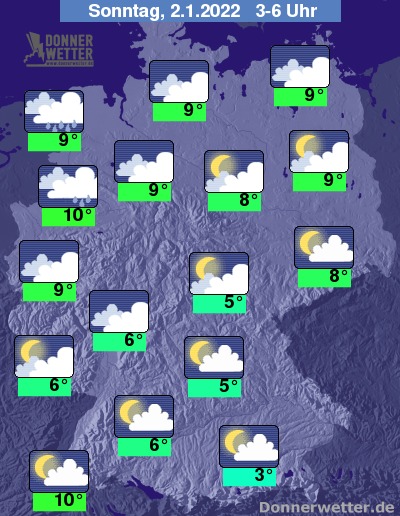 In der Nacht zum Sonntag ist es vor allem im Süden oft locker bis wechselnd, über der breiten Landesmitte meist stark und teils aufgelockert bewölkt, dazu bleibt es trocken. Im Nordwesten und Norden ist es weitgehend bedeckt und im Nachtverlauf zieht hier gebietsweise Regen durch. Die Temperatur sinkt auf 10 Grad in Münster und bis 3 Grad in München.