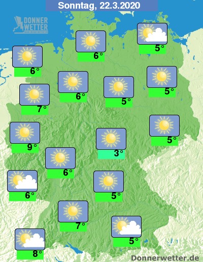 Am Sonntag herrscht verbreitet sehr sonniges und trockenes Hochdruckwetter und es ziehen nur selten lockere Wolken durch. Die Höchstwerte steigen dazu auf sehr kühle 3 Grad im Grabfeld und bis 9 Grad in der Kölner Bucht.