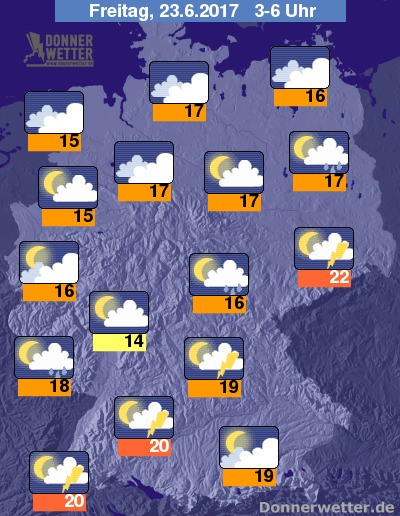 In der Nacht ziehen sich Schauer und Gewitter in die Südhälfte des Landes zurück. Zwischen Schwarzwald und Erzgebirge kommt es weiterhin vereinzelt zu Gewittern. In der Nordhälfte ist der Himmel hingegen meist wechselnd bis dicht bewölkt, es bleibt jedoch weitgehend trocken.