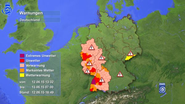 Gewitterzellen im Westen, z.B. in Köln und in Baden-Württemberg, Saarland und RP. Bitte betrachten Sie unsere Blitzkarte mit den ersten Gewittern.