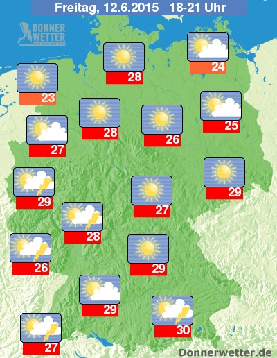 Schauer und Gewitter finden sich am Freitagabend im Westen, Südwesten sowie am Alpenrand. Entlang der Mittelgebirge scheint überwiegend die Sonne. Die Temperaturen liegen bei Werten um 23 bis 30 Grad.