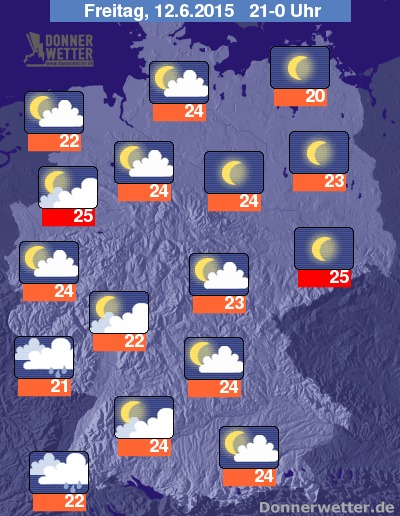 In der ersten Nachthälfte zeigt sich der Himmel vor allem im Nordosten klar, im übrigen Bundesgebiet überwiegt lockere oder wechselnde Bewölkung. Schauer sind meist nur im Südwesten zu erwarten. Die Temperaturen liegen bei warmen 25 bis 21 Grad C.