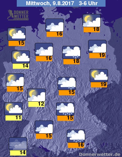 In der Nacht zum Mittwoch bleibt es über der Osthälfte Deutschlands noch meist stark bewölkt und dazu fällt hier auch vielerorts, teils auch starker und gewittriger Regen. In den westlichen Landesteilen lockert die Bewölkung meist etwas auf, oft bleibt es auch noch stark bewölkt, dazu jedoch weitgehend trocken. Die Temperatur sinkt auf 19 Grad in Berlin und bis 11 Grad am Pfälzer Wald.