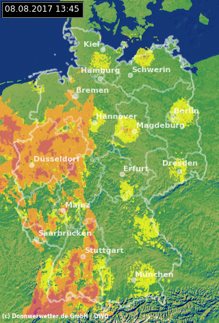 Aktuell ziehen Gewitter- und Regengebiete vor allem über NRW, den Westen Niedersachsens sowie über Baden-Württemberg hinweg. Örtlich besteht Unwettergefahr!