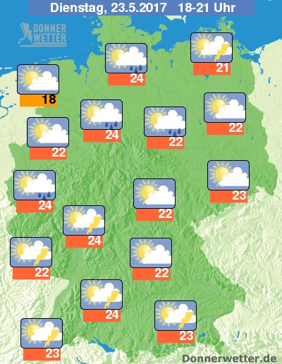 Die Temperaturen erreichen an der Nordsee Werte um 18 Grad. Um 24 Grad erreicht das Thermometer beispielsweise in der Eifel und im Odenwald.