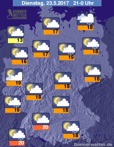 Am späten Abend klart der Himmel landesweit wieder mehr auf und ist es fast überall leicht bewölkt. Im Nordosten und im äußersten Süden sind Schauer möglich. Ansonsten bleibt es überall trocken.
