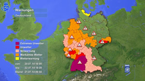 Am Abend ist es von der Mitte bis nach Süden weiterhin meist stark bewölkt und es fällt vielfach gewittriger und vor allem nach Südosten noch ergiebiger Regen. Im Norden ist es dagegen häufig aufgelockert bewölkt und besonders im Ostseeumfeld auch häufig klar und es bleibt meist trocken. Die Temperatur liegt bei 26 Grad in Dessau und etwa 18 Grad am Alpenrand.