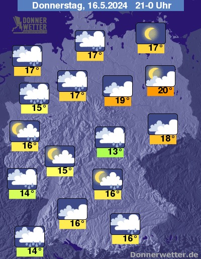 In der Nacht auf Freitag zeigt sich der Himmel über dem Westen und Süden stark bewölkt oder es ist bedeckt, dabei muss anfangs noch verbreitet mit Gewittern gerechnet werden. In den südlichen Landesteilen fällt in der Nacht teils anhaltender und kräftiger Regen mit lokalem Unwetterpotential! Im Norden und Osten bleibt es bei meist geringer Bewölkung niederschlagsfrei.