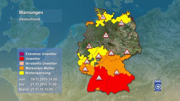 Weiterhin besteht für den Süden Unwettergefahr durch Sturm und Starkregen: