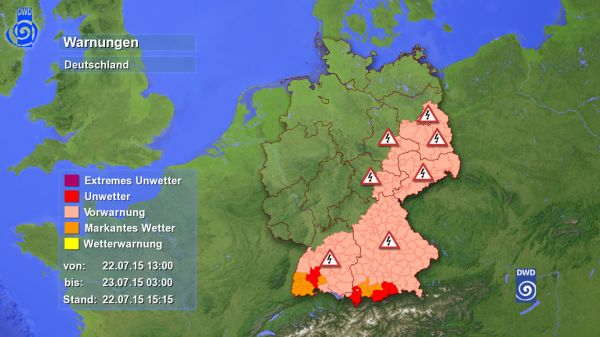 Aktuell ziehen Gewitter über den Schwarzwald und das Alpenvorland hinweg. Es bestehen Unwetterwarnungen. In ganz Bayern und entlang der Alb in B-Württemberg drohen Unwetter.