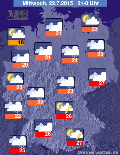 Heute Abend halten sich überwiegend dichte Wolken, im Norden und Westen ist es jedoch auch oft locker oder aufgelockert bewölkt, hier bleibt es zum Großteil trocken, sonst bilden sich aber wiederholt teils kräftige Schauer und Gewitter. Die Abendtemperatur liegt bei schwülwarmen 27 Grad in Niederschlesien und um 18 Grad in Ostfriesland.