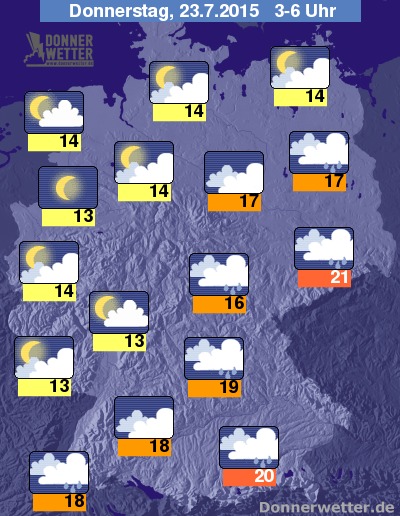 In der Nacht zum Donnerstag bleibt der Himmel über der Südosthälfte der Bundesrepublik weitgehend bedeckt und es bilden sich weitere Schauer und einzelne Gewitter. Weiter nach Norden und Westen lockert die Bewölkung hingegen meist auf und regional zeigt sich sogar ein sternenklarer Nachthimmel, dabei bleibt es trocken. Die Temperatur sinkt auf tropische 21 Grad in Görlitz und bis 13 Grad am Pfälzer Wald.