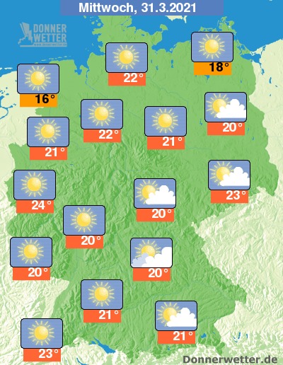 Heute zeigt sich das Wetter verbreitet sonnig, vor allem im Osten und Südosten ist es jedoch gebietsweise auch leicht bis wechselnd bewölkt, dabei bleibt es trocken. Die Temperatur erreicht 16 Grad in Wilhelmshaven und bis zu 24 Grad in Köln.