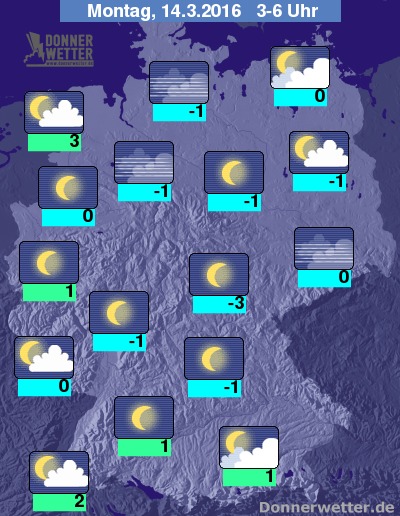 In der Nacht zum Montag ist es am Alpenrand teils stark bewölkt, jedoch trocken, im Norden ziehen auch zunehmend einige Wolken auf, dazwischen zeigen sich jedoch häufig auch die Sterne und zudem bleibt es trocken. In den übrigen Landesteilen ist es verbreitet sternenklar und es ziehen höchsten mal ein paar Wolken durch, dazu bleibt es trocken. Die Temperatur sinkt auf 3 Grad in Ostfriesland und bis -3 Grad im Vogtland.