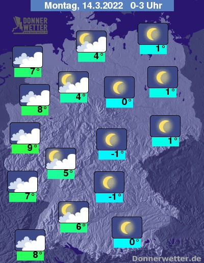 In der Nacht auf Montag nimmt die Bewölkung von Westen her weiter zu, zwischen dem Pfälzer Bergland und dem Emsland kann gebietsweise auch etwas Regen fallen. Weitgehend wolkenlos zeigt sich der Himmel zunächst noch östlich der Elbe.