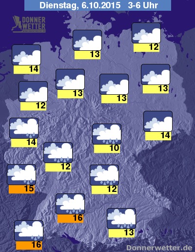 In der Nacht zum Dienstag bleibt es im Norden und Osten bei meist starker Bewölkung noch trocken, im übrigen Bundesgebiet halten sich verbreitet dichte Wolken und es fällt zum Teil starker und auch langanhaltender Regen. Im Südwesten klingen die Niederschläge zum Morgen hin ab. Die Temperatur sinkt auf 16 Grad im Kraichgau und bis 10 Grad im Vogtland.