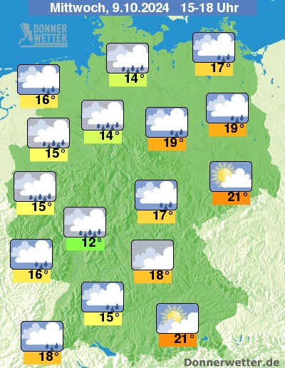 Am Mittwochnachmittag zeigt sich der Himmel über dem Westen und Nordwesten stark bewölkt oder bedeckt, dabei fällt teils schauerartig verstärker, lokal unwetterartiger Dauerregen. Es sind Unwetterwarnungen aktiv!