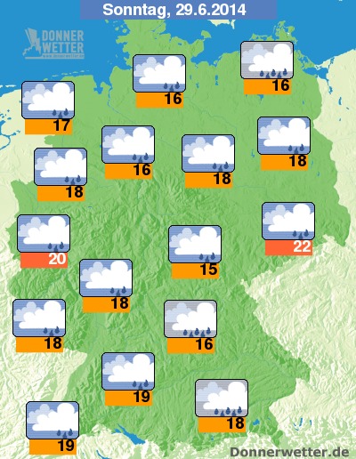 Am Sonntag bleibt es vielfach bedeckt und die Sonne hat nur wenig Chancen. Es fallen immer wieder teils gewittrige Schauer. Die Höchstwerte erreichen dabei nur noch kühle 15 Grad am Thüringer Wald und bis 22 Grad in Dresden.