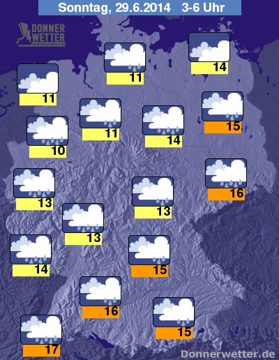 In der kommenden Nacht ziehen meist dichte Wolken durch und es fällt zum Teil ergiebiger Regen, mit gebietsweise über 15 Litern Regen auf den Quadratmeter innerhalb von nur 3 Stunden. Im Norden bleibt es überwiegend trocken. Die Temperatur sinkt auf 17 Grad in Freiburg und 10 Grad in Kleve.