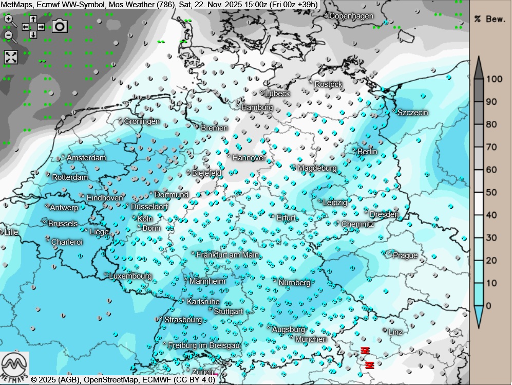 Am Samstagnachmittag zeigt sich der Himmel am Alpenrand sowie in Küstennähe wolkig, es bleibt aber meist trocken. In den übrigen Landesteilen ist es am Nachmittag heiter oder die Sonne scheint von einem wolkenlosen Himmel.