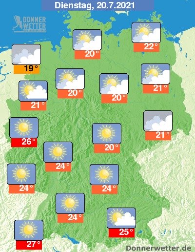 Am Dienstag zeigt sich das Wetter über der Südwesthälfte des Landes verbreitet sonnig oder es ziehen nur wenige Wolken durch. Im übrigen Bundesgebiet ist es jedoch teils stark, teils wechselnd bewölkt. Es bleibt landesweit trocken bei Höchstwerten von 19 Grad an der Nordsee und bis 27 Grad im Breisgau.