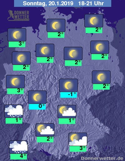 In der Nacht zum Montag zeigt sich der Himmel verbreitet sternenklar und es ziehen nur hier und da wenige Wolken durch. Direkt am Alpenrand ist es jedoch weiterhin stark bewölkt, dazu fällt hier gebietsweise auch Schnee, im übrigen Land bleibt es jedoch trocken. Die Temperatur sinkt auf 0 Grad an der Nordsee und bis -6 Grad im Thüringer Becken.