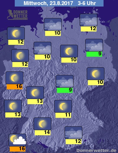 In der Nacht zum Mittwoch ist es praktisch landesweit sternenklar, hier und da lockere Wolken ziehen über den Breisgau, dabei bleibt es überall trocken. Die Temperatur sinkt auf milde 16 Grad in Köln und bis 9 Grad im südlichen Brandenburg.