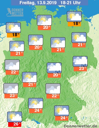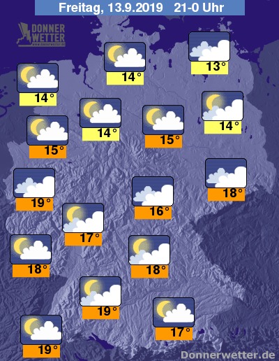 Am Abend halten sich über der Landesmitte noch dichtere Wolken und insbesondere über den östlichen Mittelgebirgen kann es noch tröpfeln. Sonst spendet die untergehende Sonne zwischen einigen Wolkenfeldern noch Helligkeit und wohltuende Wärme.