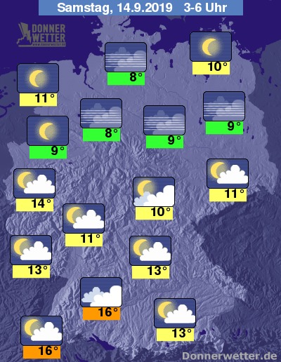 Bis zu den Frühstunden gehen die Temperaturen in der Nordhälfte auf 7 bis 11 Grad zurück, im Süden bleibt es mit 10 bis 16 Grad allgemein milder.