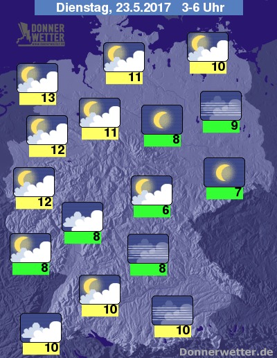 Dazu bekommen wir am Morgen Temperaturen um 6 Grad in Thüringen und 13 Grad im Ostfriesland.