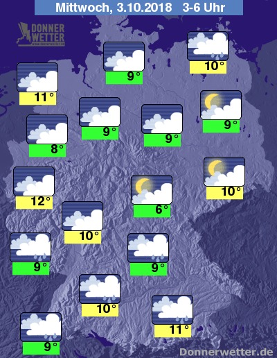 Die Temperaturen gehen bis zu den Frühstunden wegen der meist schützenden Wolkendecke und lebhaften Strömung nur leicht zurück und liegen bei 6 bis 12 Grad.