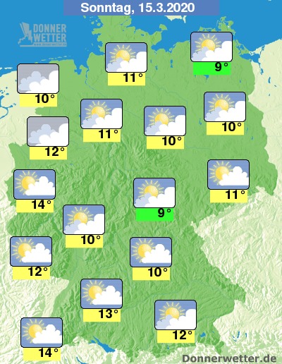 Am Sonntag zeigen sich oft heitere Abschnitte, jedoch ziehen gebietsweise auch dichte Wolken durch, dabei bleibt es aber trocken. Die Temperatur steigt auf milde 9 Grad im Vogtland und bis 14 Grad entlang des Rheins.