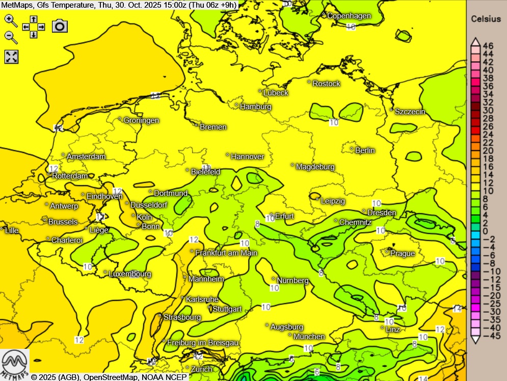 Die Wetter- und Temperaturkarte für Donnerstagnachmittag (15:00 Uhr) nach GFS: