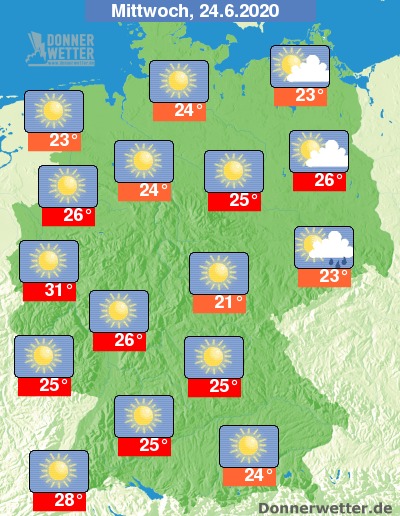 Die Höchsttemperaturen liegen zwischen 21 Grad in den Mittelgebirgen und 31 Grad am Mittelrhein.