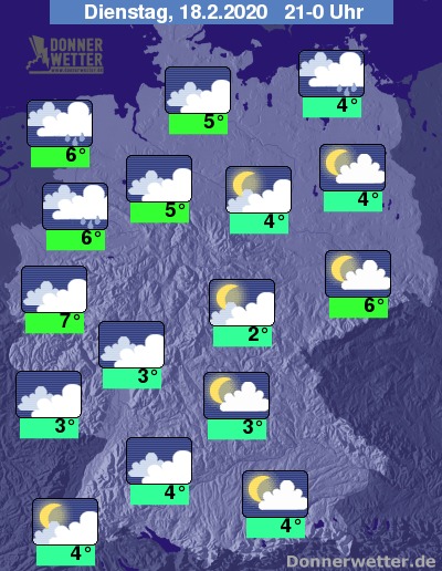 Bis Mitternacht breitet sich der Regen vom Emsland allmählich landeinwärts aus und es können stürmische Windböen auftreten. Sonst wechseln sich Wolken und Sterne miteinander ab, wobei die Wolken von Westen zunehmen.