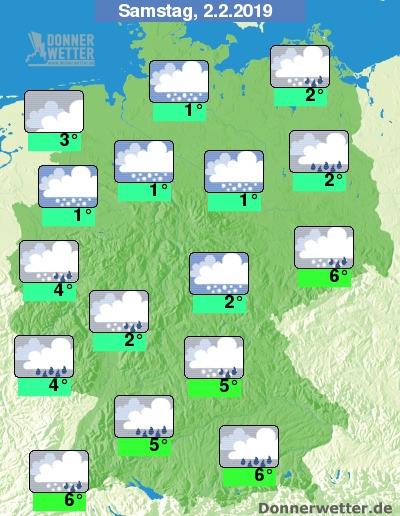 Heute halten sich überwiegend dichte Wolken und es fällt wiederholt Schnee, besonders über der Südhälfte fällt häufig Schneeregen oder Regen. Am Nachmittag bleibt es zumindest im Süden größtenteils trocken. Die Temperatur steigt auf 1 Grad in der Norddeutschen Tiefebene und bis 6 Grad im Breisgau.