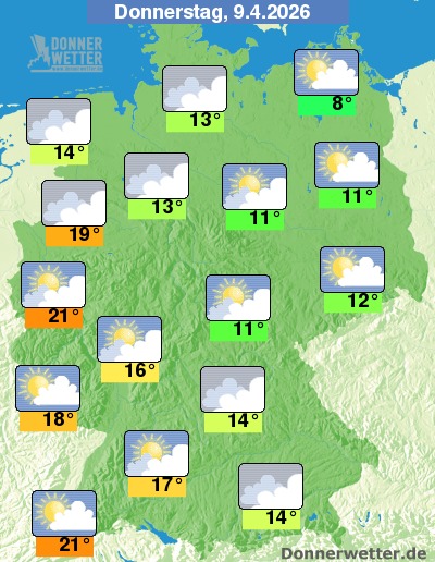 Am Donnerstag zeigt sich das Wetter zum Teil heiter und die Sonne kann sich längere Zeit blicken lassen. Gebietsweise ziehen allerdings auch einige, teilweise auch dichte Wolken durch. Es bleibt aber im gesamten Land trocken bei Höchstwerten von teils nur 8 Grad an der Ostseeküste und bis 21 Grad im Breisgau.