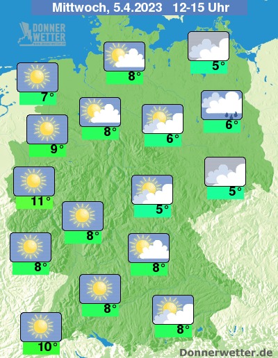 Heute Nachmittag scheint über der Westhälfte Deutschlands verbreitet die Sonne bei höchstens lockeren Wolkenfeldern. Weiter nach Osten hin ist der Himmel zunehmend dicht bewölkt und im Osten selbst kann es auch etwas regnen. Im übrigen Land bleibt es trocken bei 5 Grad in Chemnitz und bis 11 Grad in Bonn.