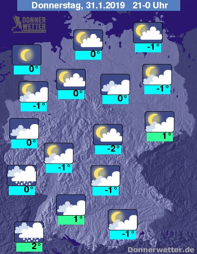 Am Abend bleibt der Himmel über weiten Landesteilen bedeckt oder aufgelockert bewölkt, vor allem in der Nordhälfte ist es teils auch locker bewölkt. Es bleibt zunächst überwiegend trocken, um 1 bis 4 Grad.