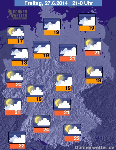 Am Abend ziehen besonders im Nordwesten, aber auch sonst im Westen bis in den Südwesten teils dichte Wolken mit möglichen Schauern, zum Teil auch mit Gewittern durch. Sonst bleibt es bei meist aufgelockerter Bewölkung trocken. Die Abendwerte liegen bei teils noch 24 Grad im Rhein-Main-Gebiet und 17 Grad auf den Ostfriesischen Inseln.