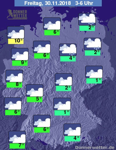 Zu den Frühstunden liegen die Temperaturen in der Osthälfte bei 1 bis 4 Grad, in der Westhälfte bei milden 5 bis 10 Grad.