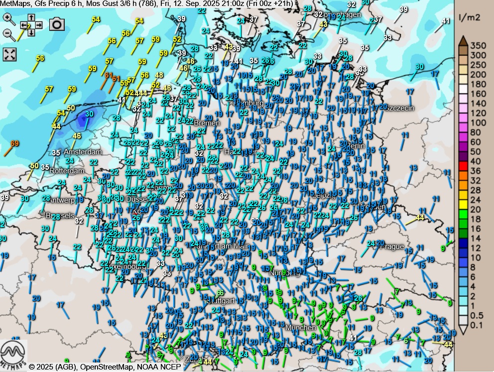 Die Sechs-Stunden-Böen und -Regensummen bis 21:00 Uhr sowie die Lufttemperaturen um 15:00 Uhr nach GFS: