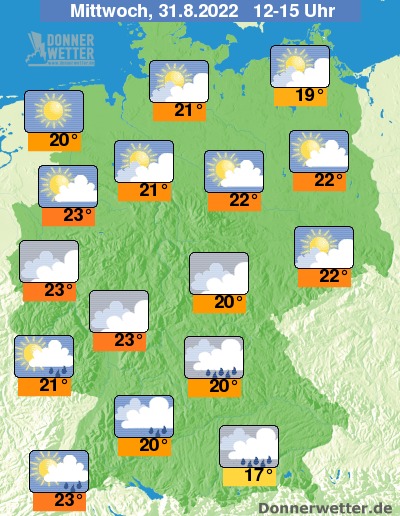 In den Nachmittagstunden überwiegt über der Nord- und Osthälfte Deutschlands lockere oder aufgelockerte Bewölkung, teils ist es auch heiter, an der Nordseeküste auch sonnig. In der Südhälfte ist der Himmel am Nachmittag meist stark bewölkt und immer wieder sind schauerartige Regenfälle sowie lokale Gewitter möglich.
