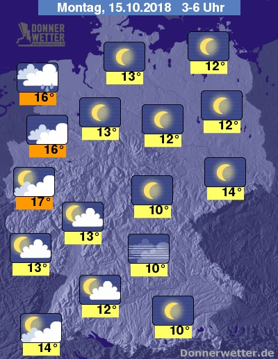In der folgenden Nacht bleibt der Himmel über der Osthälfte weitgehend sternenklar, weiter nach Westen hin nehmen die Wolkenanteile hingegen stetig zu und am Niederrhein und der Ems fällt gegen Morgen auch gebietsweise Regen, sonst bleibt es trocken. Die Temperatur sinkt auf 17 Grad in Köln und bis 10 Grad im Berchtesgadener Land.