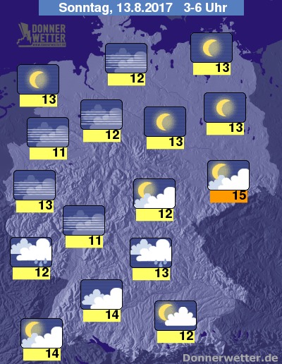 In der folgenden Nacht bleibt es über dem Süden der Republik häufig stark oder aufgelockert bewölkt, dazu kann hier und da auch Regen fallen. Weiter nach Norden hin ist es anfangs noch teils stärker bewölkt, jedoch klart der Himmel immer weiter auf und es bleibt trocken. Die Temperatur sinkt auf 15 Grad in Dresden und bis 11 Grad am Niederrhein.
